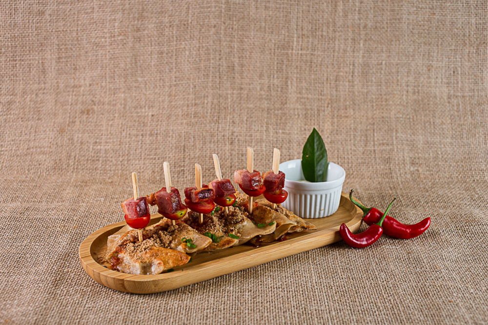 Pirogue na chapa, recheado com queijo minas, ora-pro-nóbis, molho de nata fresca, farofa de torresmo e geleia de pimenta com jabuticaba.