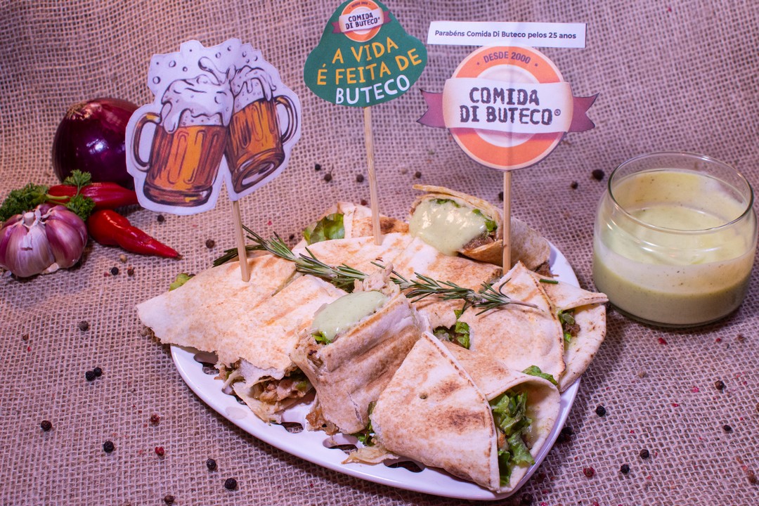 pão sírio, molho de alho, patinho desfiado, pimentão verde, alface, tomate e cebola.
