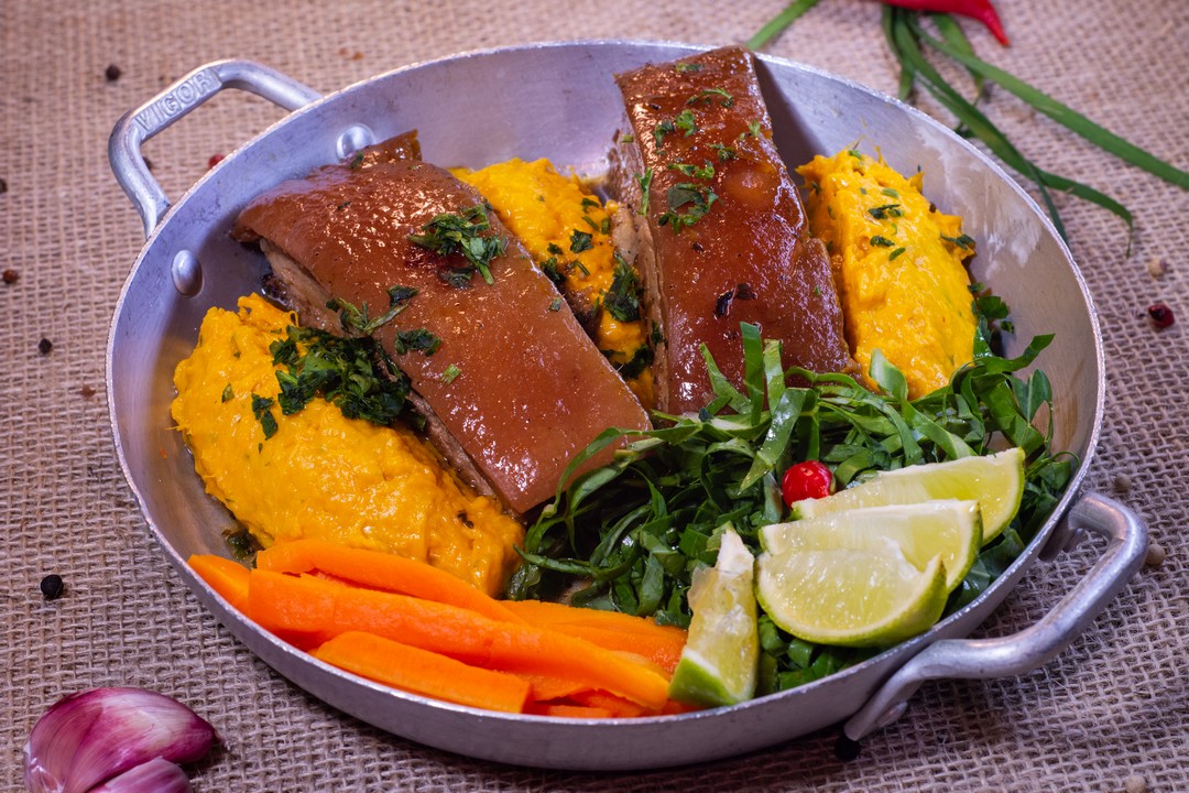pancetta glaceada com purê de abóbora. Acompanha couve e cenoura.