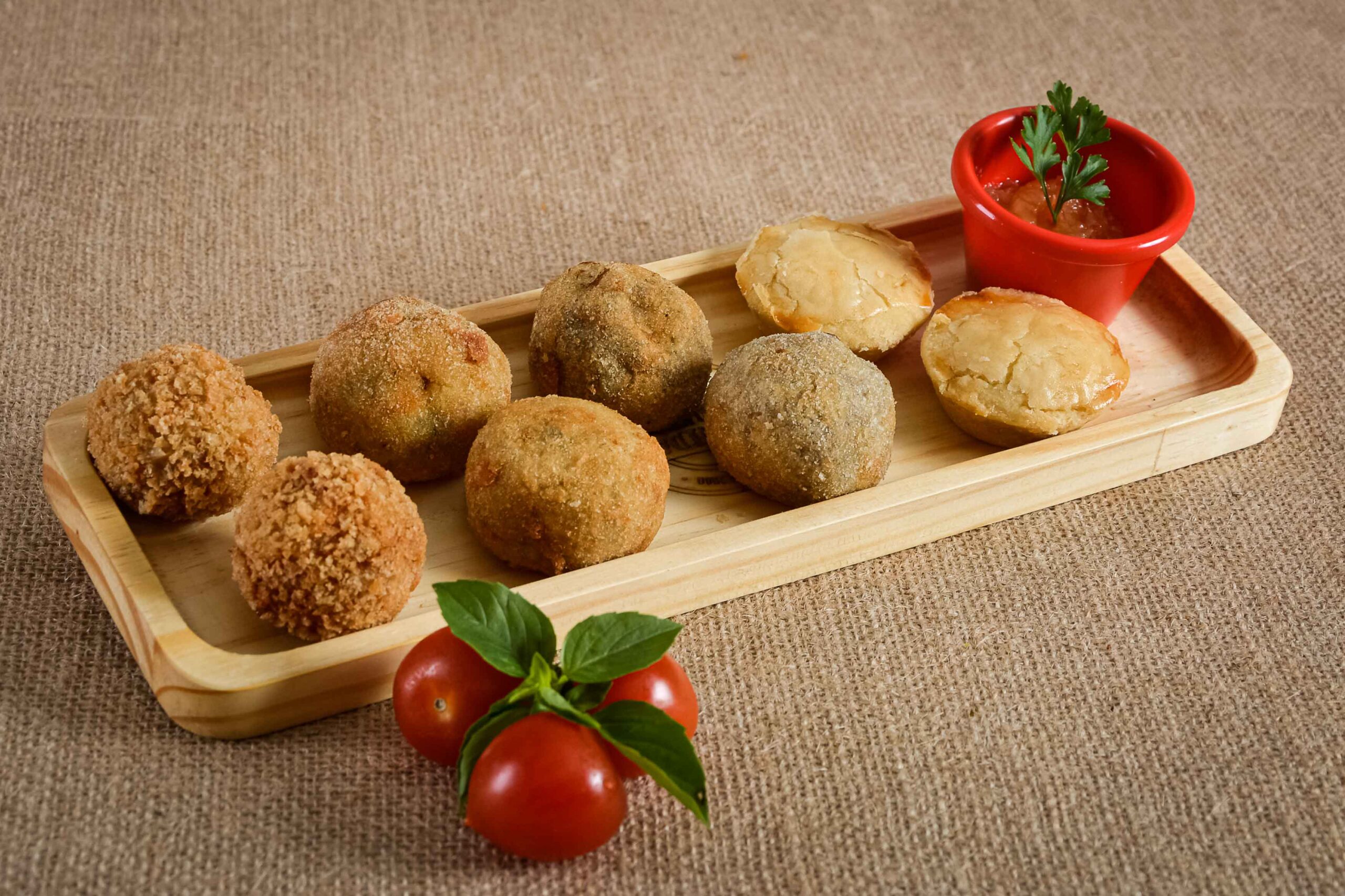 enroladinho de sururu com batata, enroladinho de lombo de porco com abacaxi cozido, enroladinho de feijoada e um miniempadão de frango e pernil com linguiça molhadinho. Todos acompanhados pelo molho especial da casa.