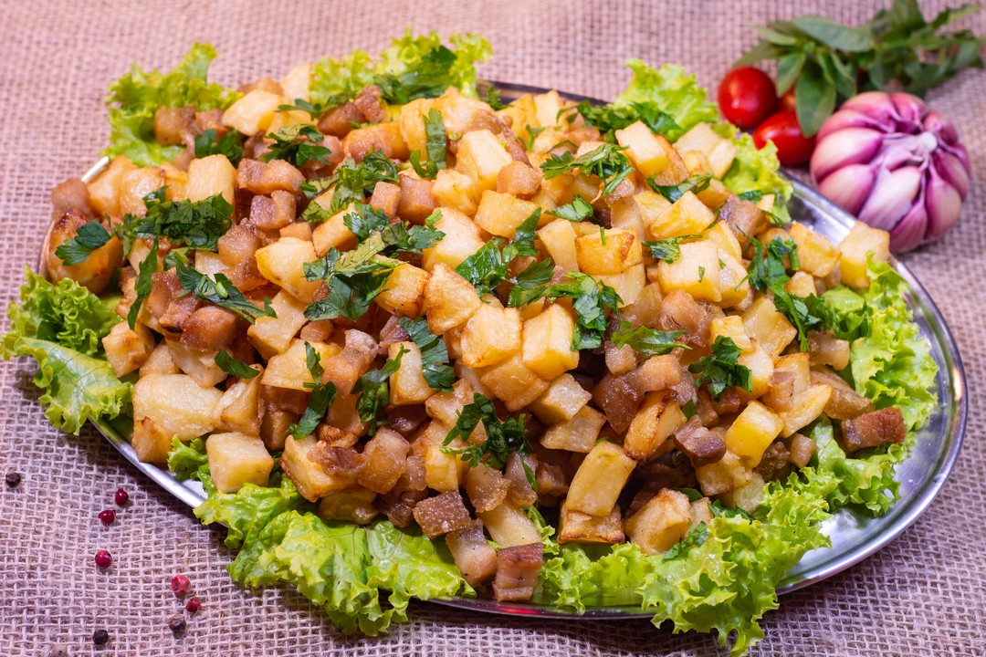 batata natural e pancetta cortada em cubos, salsa picada e temperada com sal. Serve 3 pessoas.