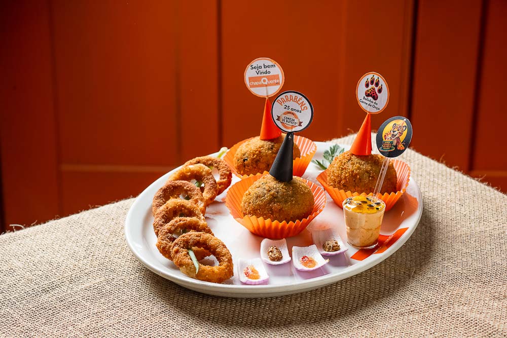 bolinhos de 120g composto por uma crosta crocante e que envolve a carne de onça, servida crua em seu interior. Acompanha anéis de cebolas com mostarda djon, mousse de maracujá e geleia de abacaxi com pimenta.