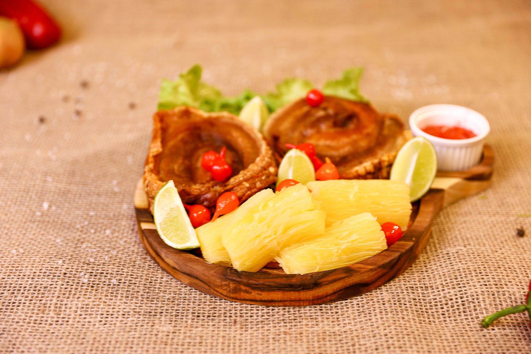 pancetta de rolo cozida e depois frita acompanha mandioca cozida, geleia de pimenta e pimenta-biquinho.