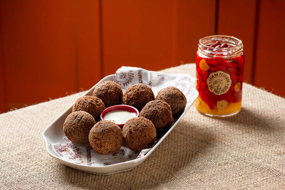 bolinho de feijoada recheado com couve e bacon, acompanha molho de alho e pimenta da casa.