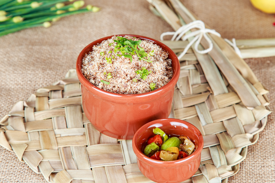 paçoca de carne de sol com feijão-verde debulhado e queijo coalho.