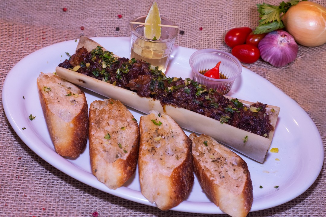 ragu de rabada com gremolata, servido no osso de tutano com torradas caseiras, acompanha uma dose de cachaça da casa.
