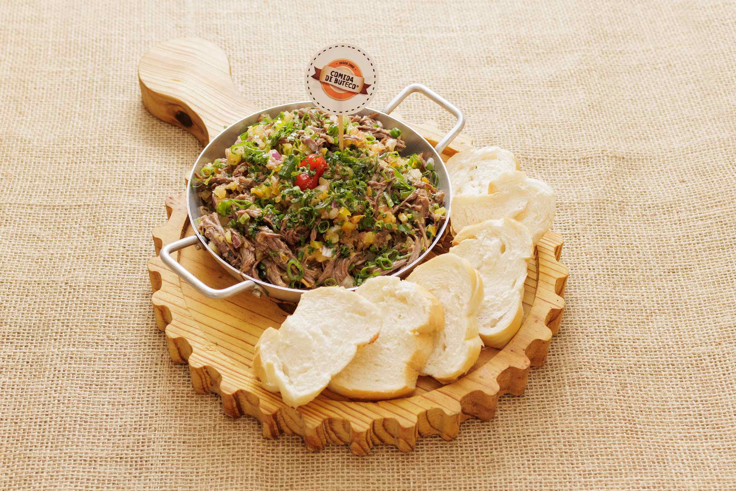 fraldinha cozida e desfiada, com cebola e tomate. Acompanha fatias de pão.