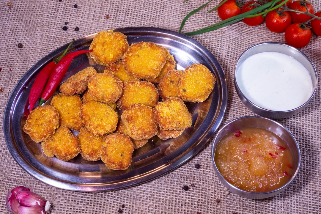 empanado de frango, acompanhado de molho de alho e geleia de abacaxi apimentada.