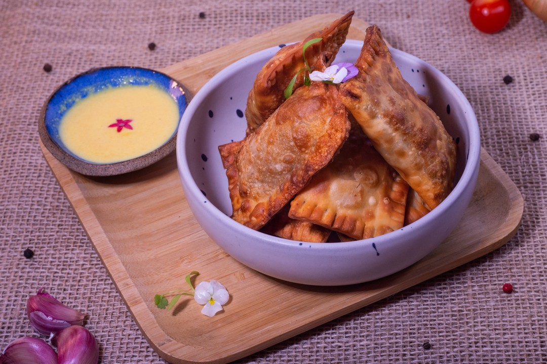pastel recheado de lomo saltado (filé-mignon temperado com especiarias), acompanha molho de huancaina (pimenta amarela peruana).