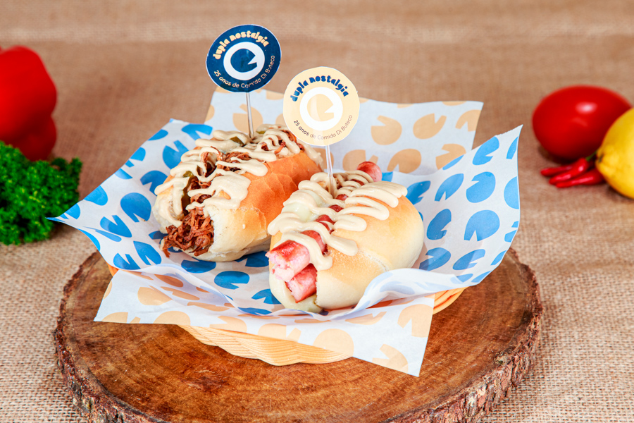 2 sanduíches de buteco: carne assada desfiada com mostarda dijon e picles; sanduíche de linguiça artesanal regado ao molho beneh.