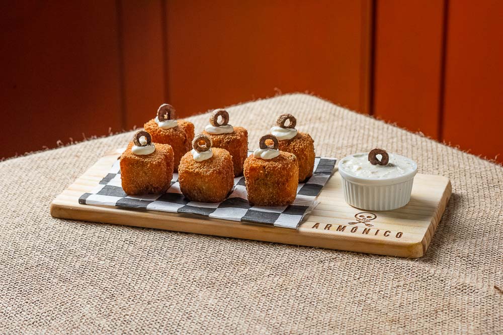 dadinho feito com postas de bacalhau desfiado, recheado de cream cheese e finalizado com a pipoca de azeitona preta, acompanhado de um sour cream.