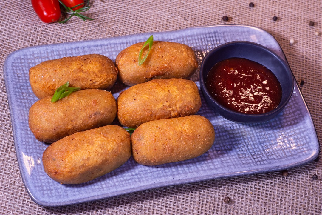 bolinho de cupim com alho-poró. Acompanha goiabada com pimenta-dedo-de-moça.