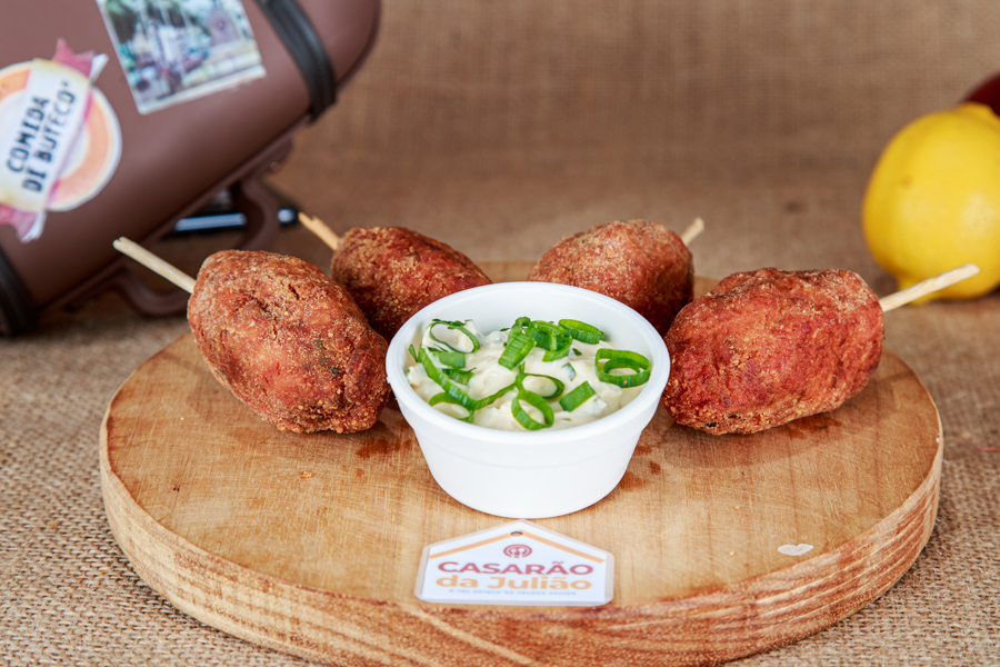 espetinho de linguiça temperada, recheado com costela desfiada e queijo.