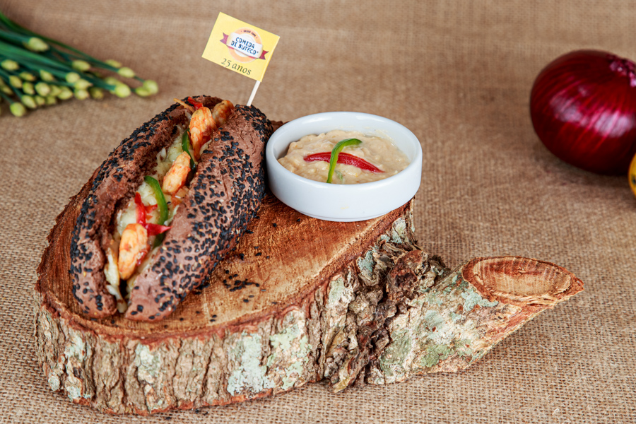 sanduíche de baguete de cerveja preta recheado de camarão flambado no vinho branco, com molho de tomate artesanal coberto de muçarela gratinada.