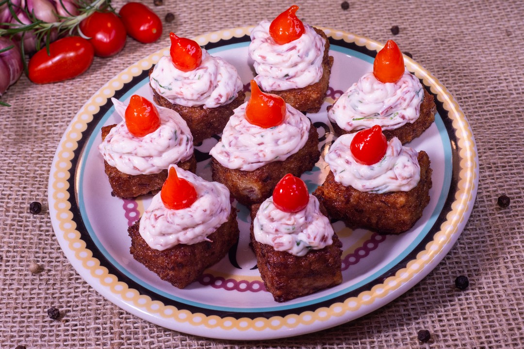 dadinho de tapioca recheado com carne-seca, coberto com queijo cremoso de carne-seca e pimenta-biquinho.