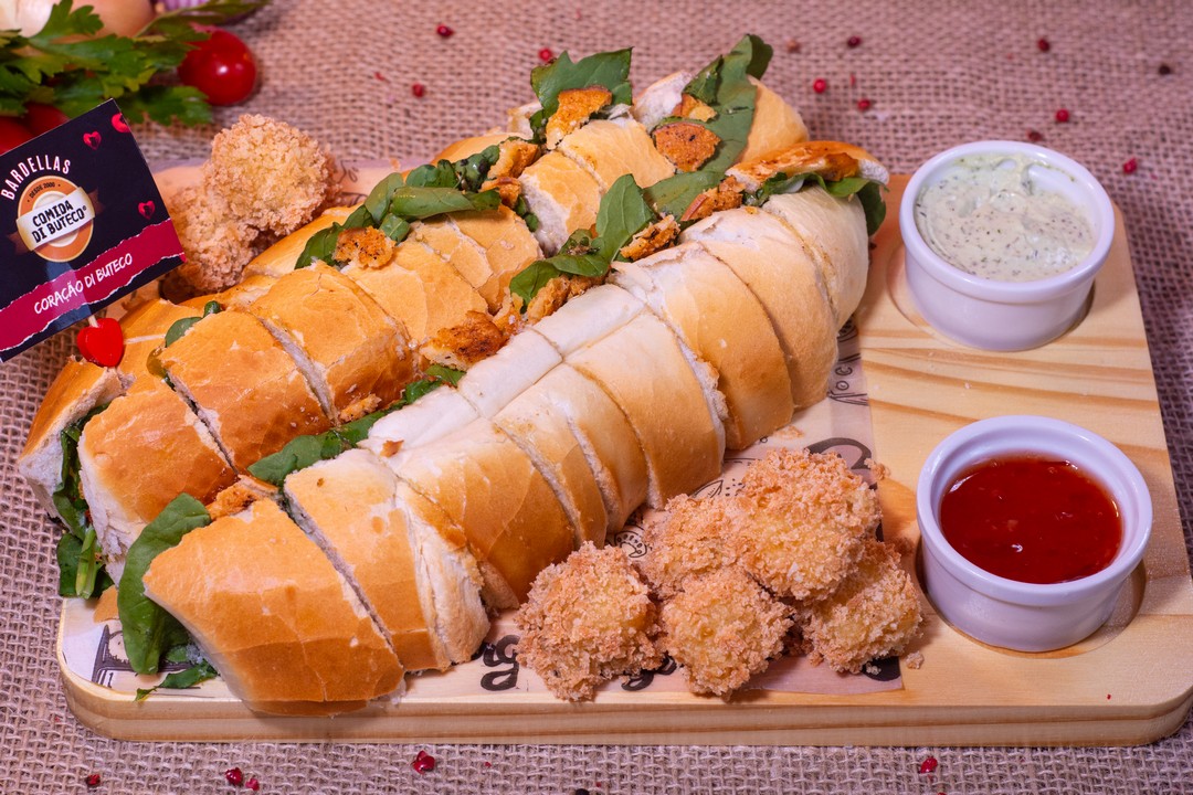 lanche em formato boquinha de anjo, recheado com coração de frango, vinagrete morno, queijo crispy e maionese defumada. Acompanha queijo coalho empanado, geleia picante e maionese verde.
