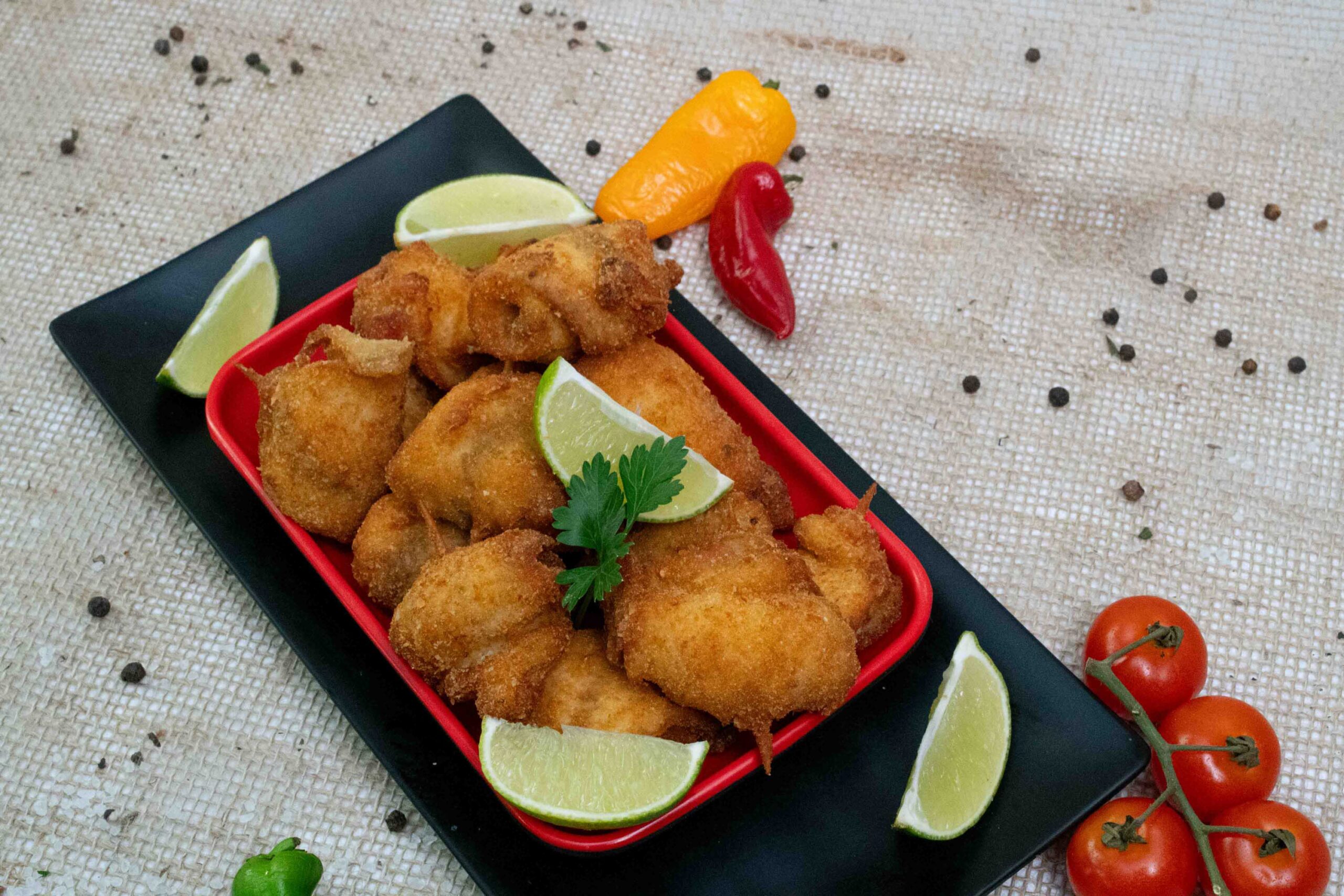 filé de acaragel recheado com provolone, um toque de azeitona, empanado e frito com um pequeno detalhe de bacon.