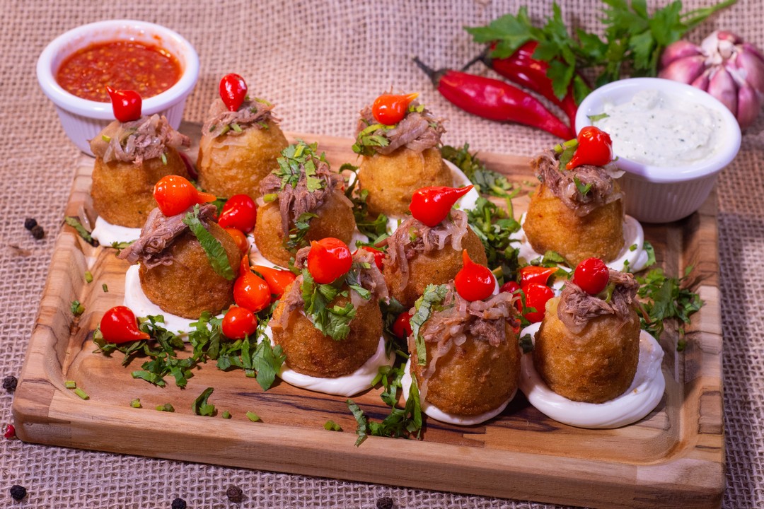 aipim do nordeste, com uma costela desfiada acebolada, com catupiry, pimenta-biquinho e coentro. Acompanha maionese da casa e molho de pimenta-biquinho.