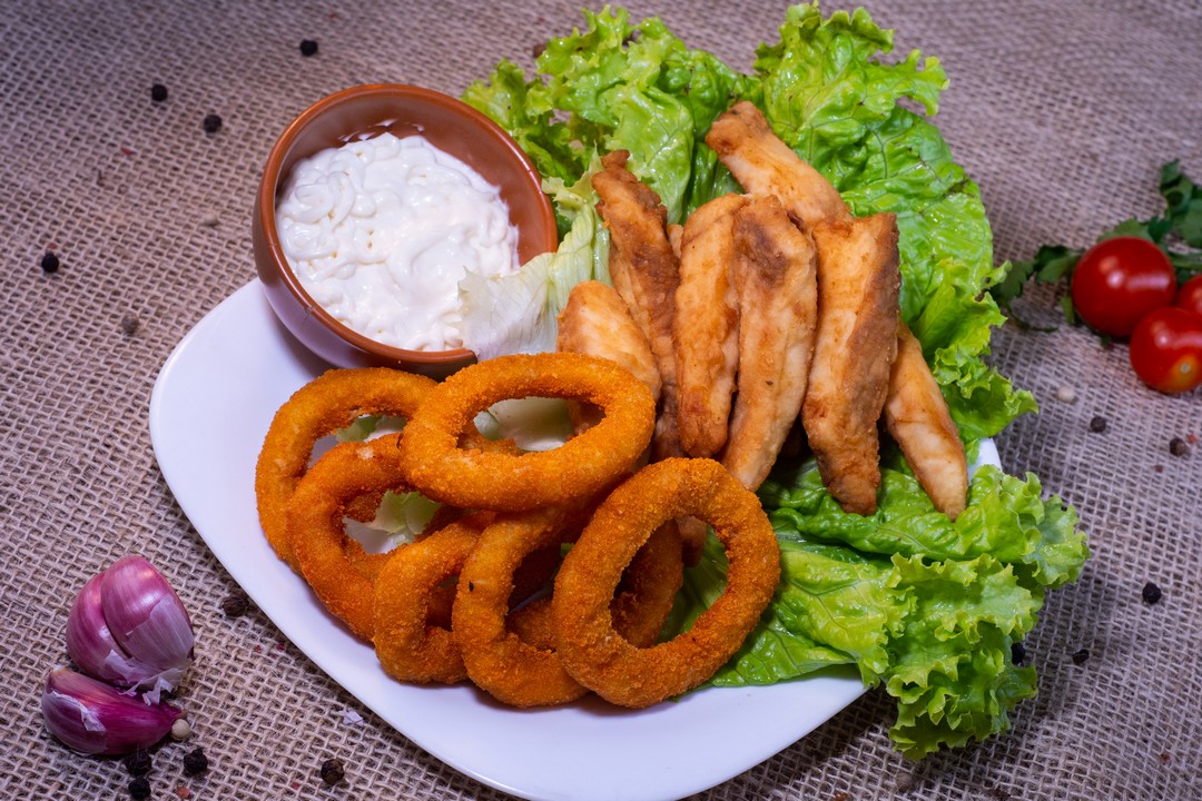 saint peter à doré com onion ring, com acompanhamento de maionese artesanal defumada.