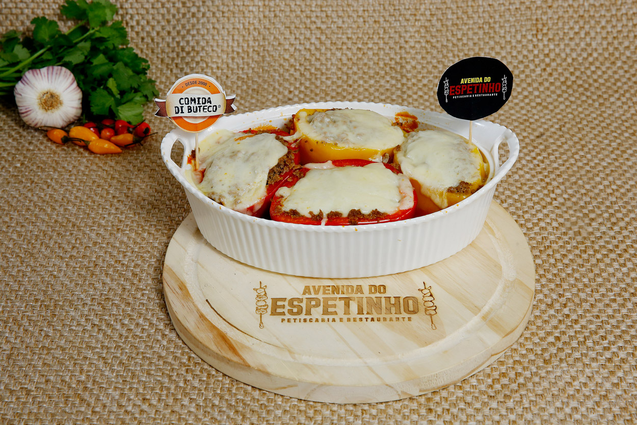 pimentão recheado com carne moída coberto com queijo muçarela e gratinado.