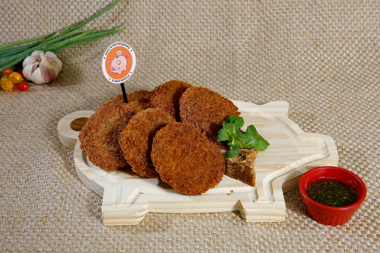 disco de porco recheado com requeijão e empanado no mix de farinha de torresmo e panko. Acompanha molho vinagrete agridoce e refrescante de rapadura com gengibre, hortelã, cebola e limão.