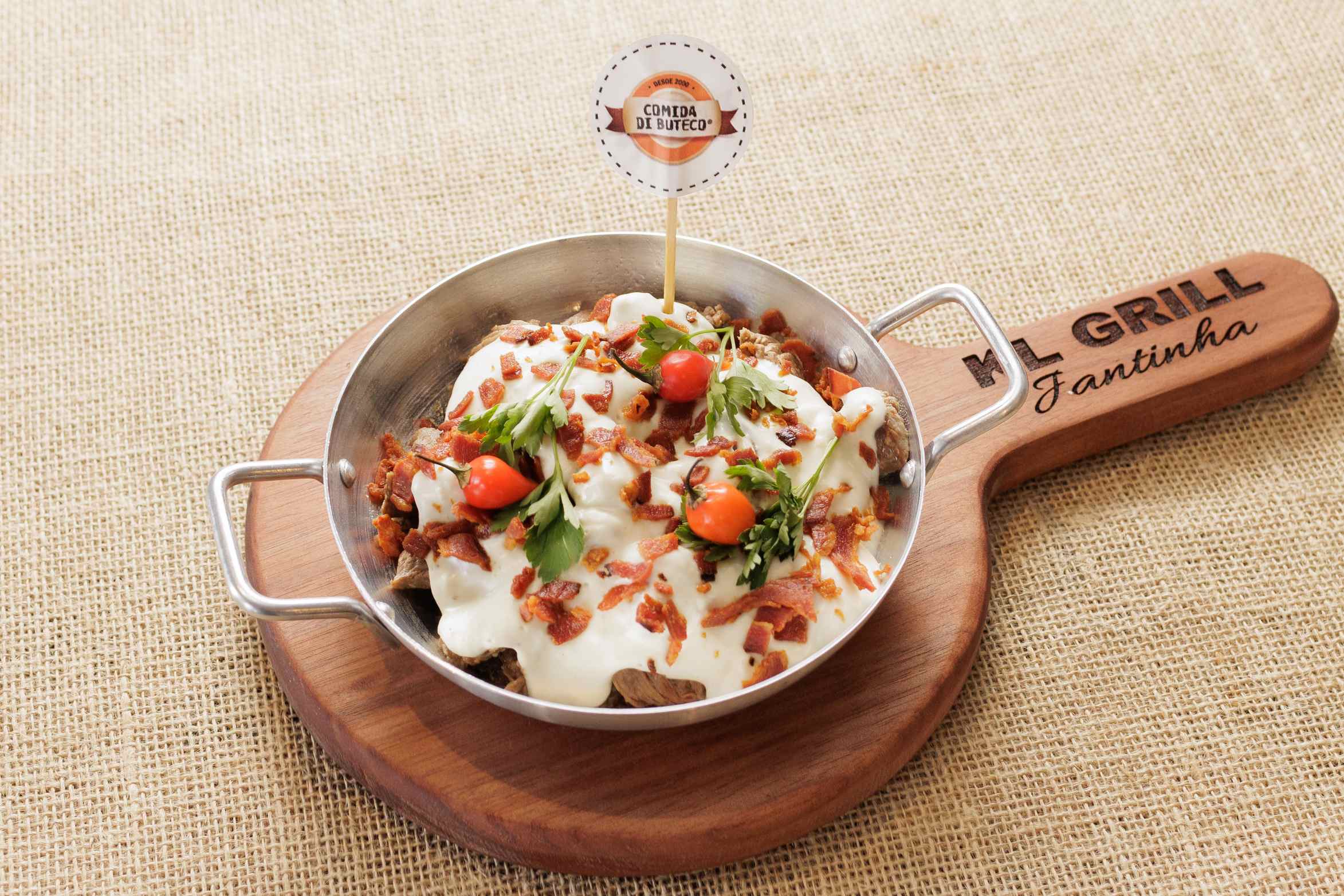 tiras de filé com creme de gorgonzola com crispy de bacon.