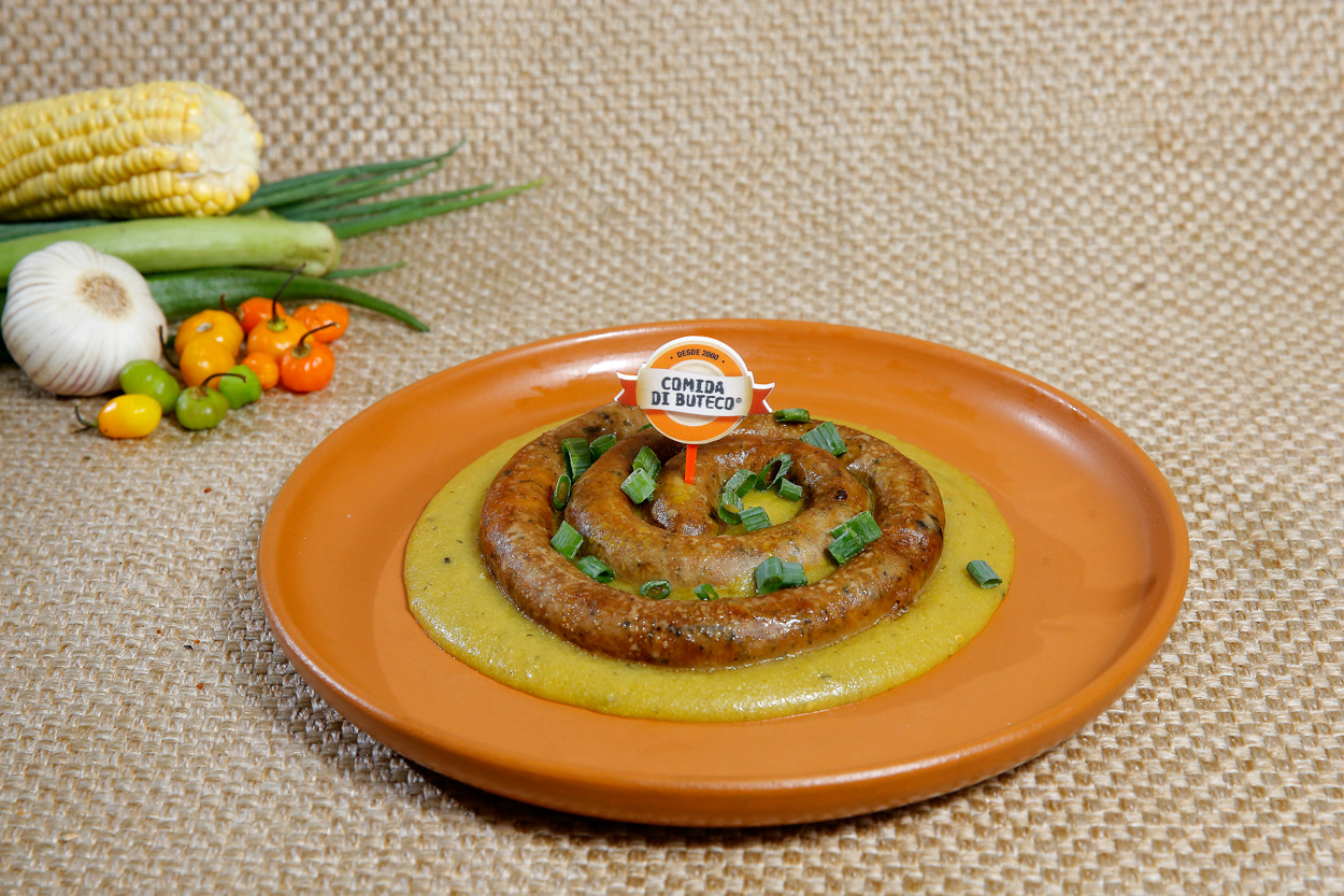 linguiça de frango da casa, com quiabo e queijo trança, servido com angu de frango.