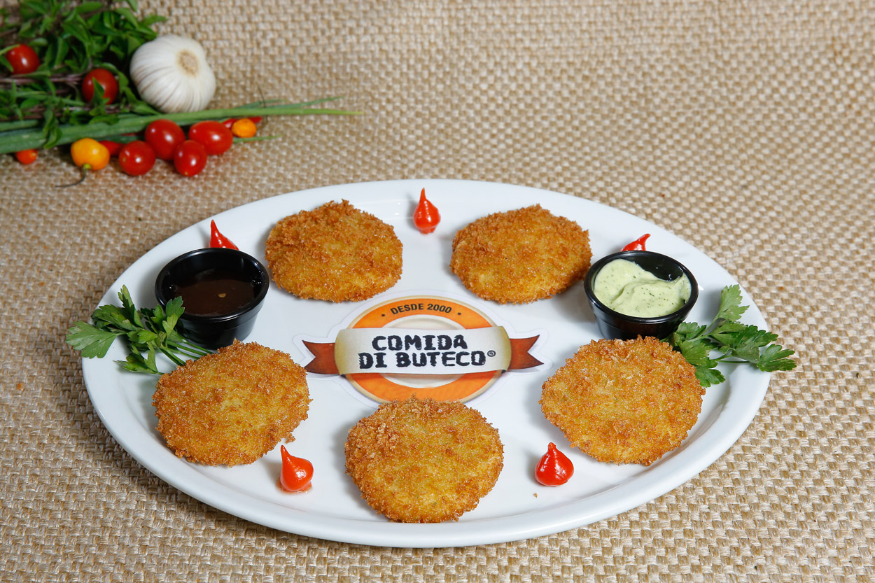 disco de massa de mandioca, recheado com queijo muçarela, catupiry e cupim desfiado, servido com molho especial de casa e geleia de pimentão vermelho.