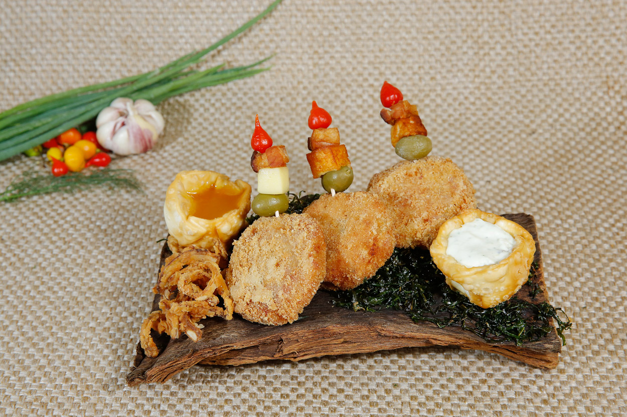 blend de carne empanado, acompanhado com molho de ervas com alho e molho de laranja.