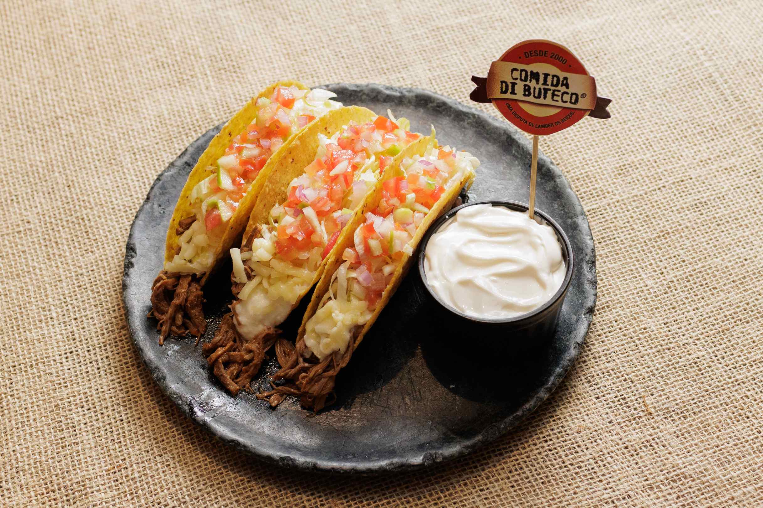 tortilhas crocantes, recheadas com carne de fraldinha, sour cream, muçarela e alface-americana. Acompanha vinagrete e molho de alho.