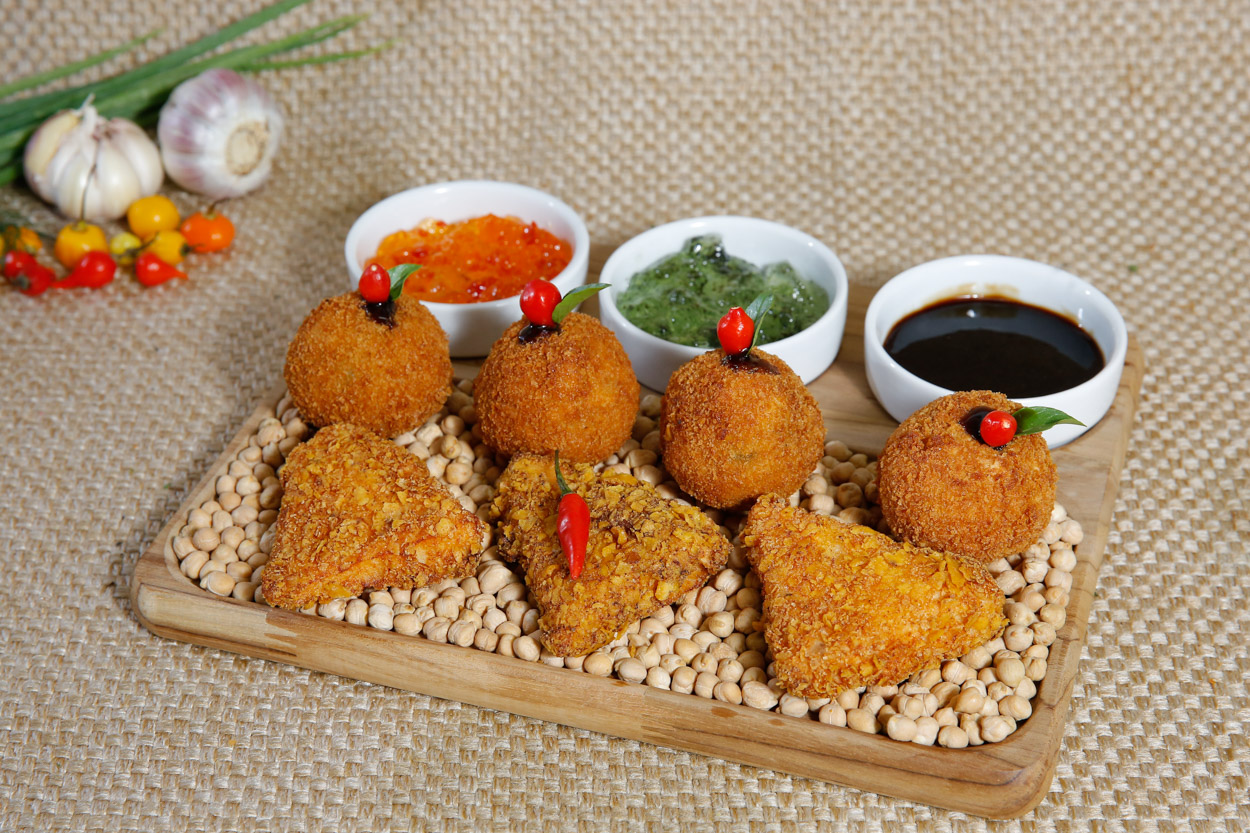 bolinho de salmão com cream cheese, recheado com requeijão cremoso, filé de tilápia, empanado na farinha especial. Acompanha três opções de molhos: geleia de pimenta, geleia refrescante e molho tarê.