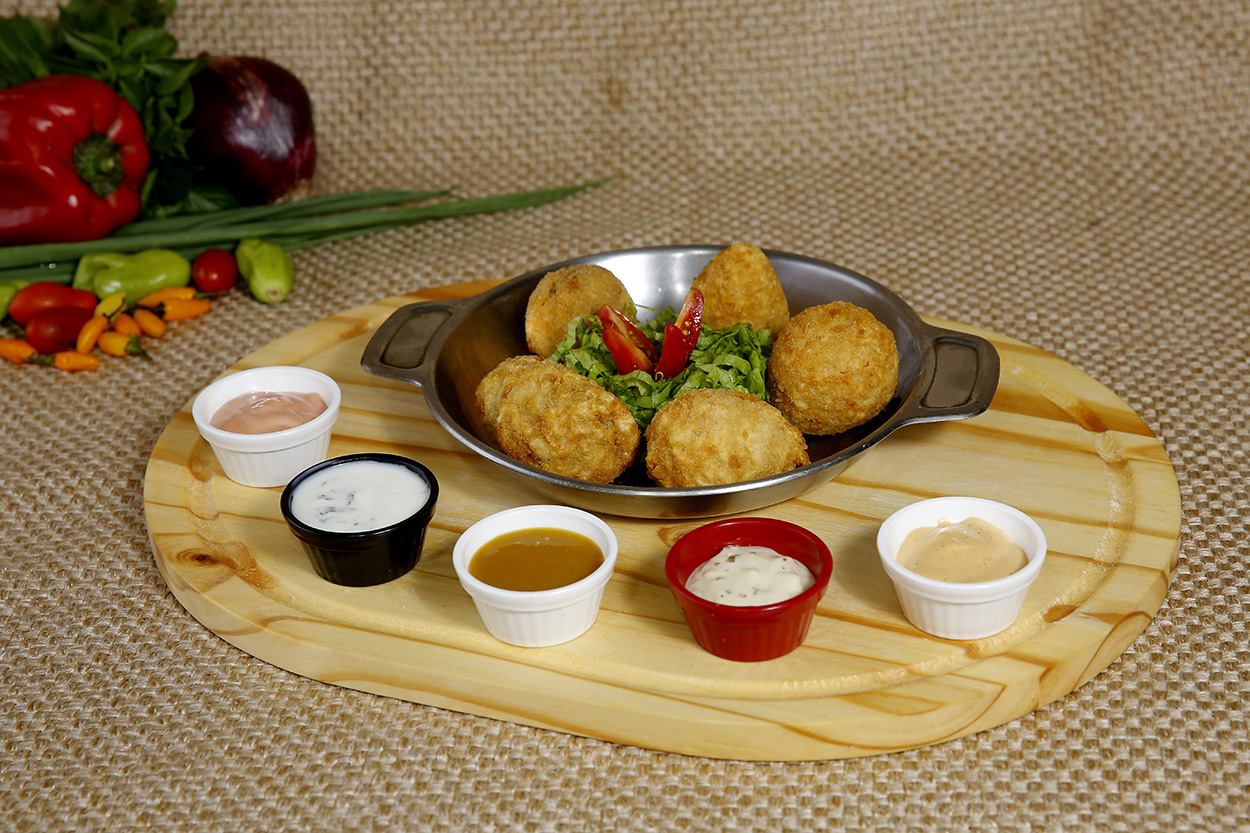 5 tipos de bolinhos: costela desfiada, frango, copa lombo, arraia e salmão. Acompanhando de 5 molhos diferentes.